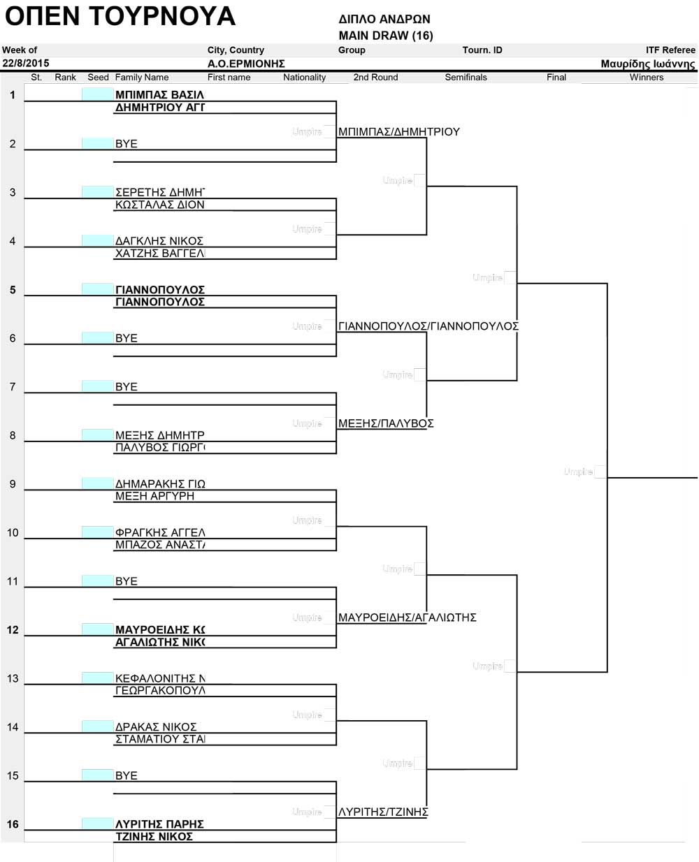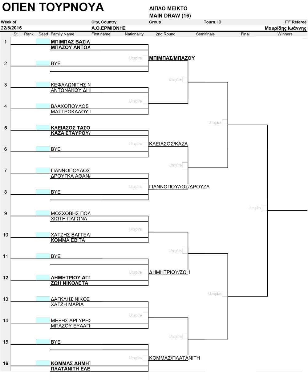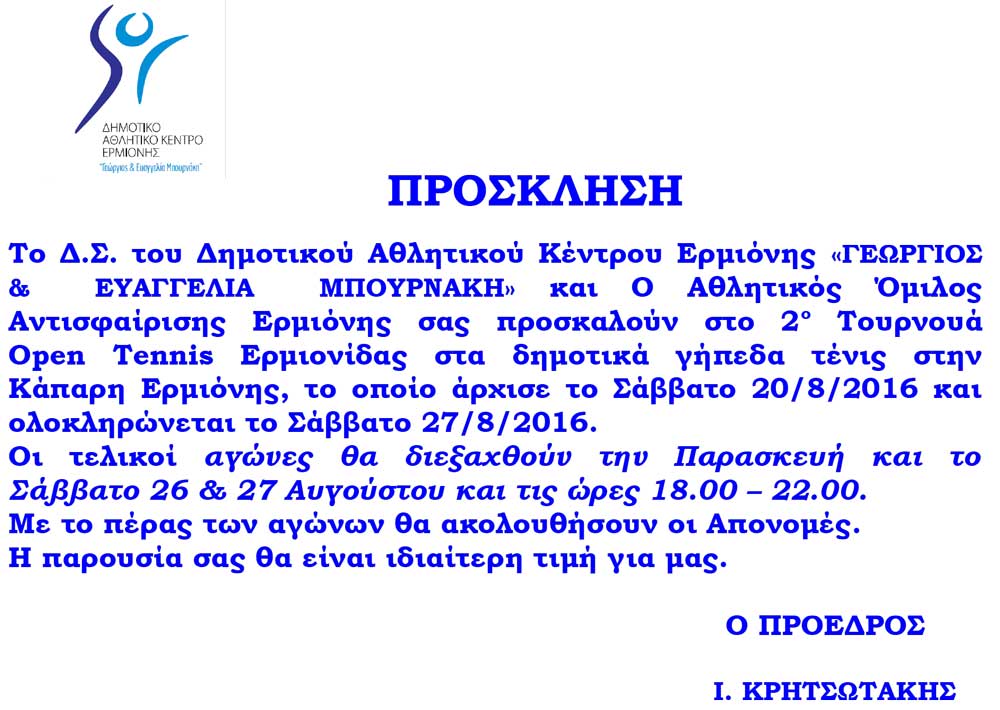 Το Δ.Σ. του Δημοτικού Αθλητικού Κέντρου Ερμιόνης «ΓΕΩΡΓΙΟΣ & ΕΥΑΓΓΕΛΙΑ ΜΠΟΥΡΝΑΚΗ» και Ο Αθλητικός Όμιλος Αντισφαίρισης Ερμιόνης σας προσκαλούν στο 2ο Τουρνουά Open Tennis Ερμιονίδας στα δημοτικά γήπεδα τένις στην Κάπαρη Ερμιόνης, το οποίο άρχισε το Σάββατο 20/8/2016 και ολοκληρώνεται το Σάββατο 27/8/2016.
