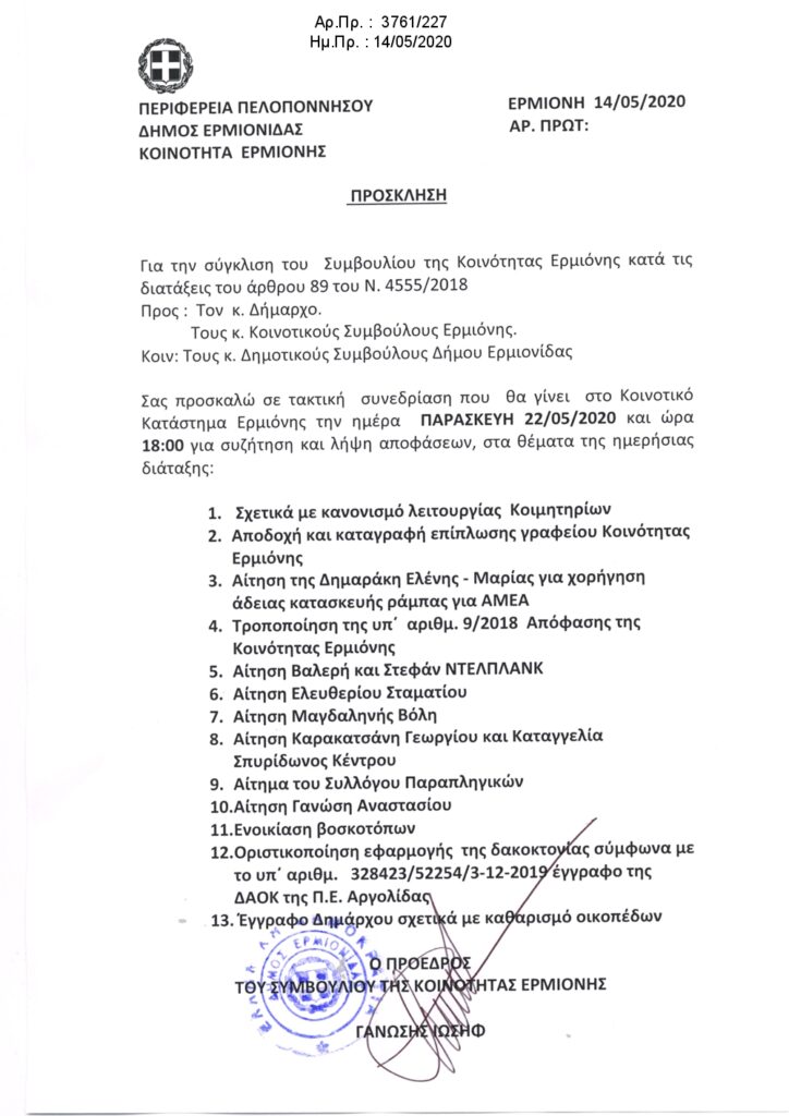 ΠΡΟΣΚΛΗΣΗ ΣΥΝΕΔΡΙΑΣΗΣ ΚΟΙΝΟΤΙΚΟΥ ΣΥΜΒΟΥΛΙΟΥ της 22/5/2020